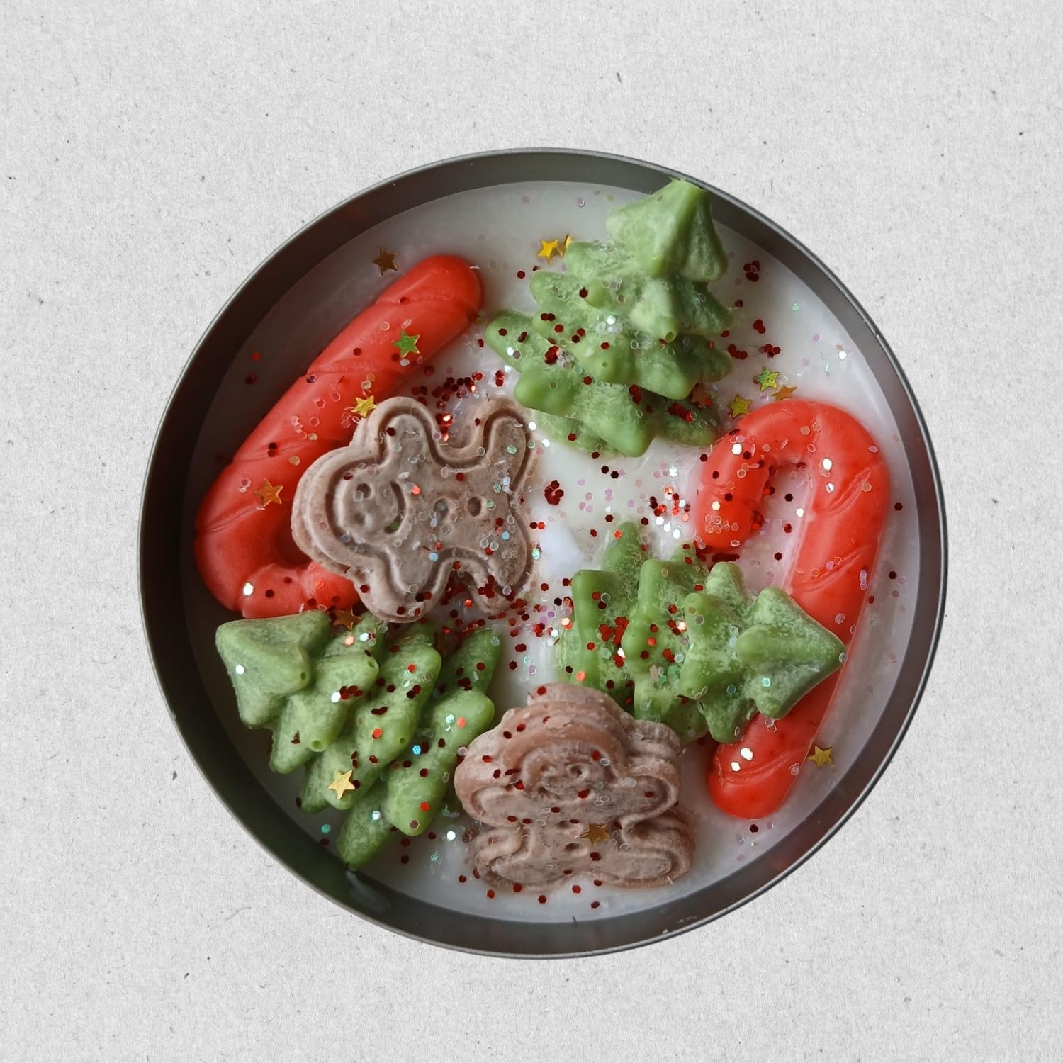 Mini ağaç, parıltı ve kurabiye şekilli detaylarla süslenmiş yılbaşı temalı el dökümü soya mum. Yeni yıl ruhunu evinize taşıyan renkli bir seçenek.