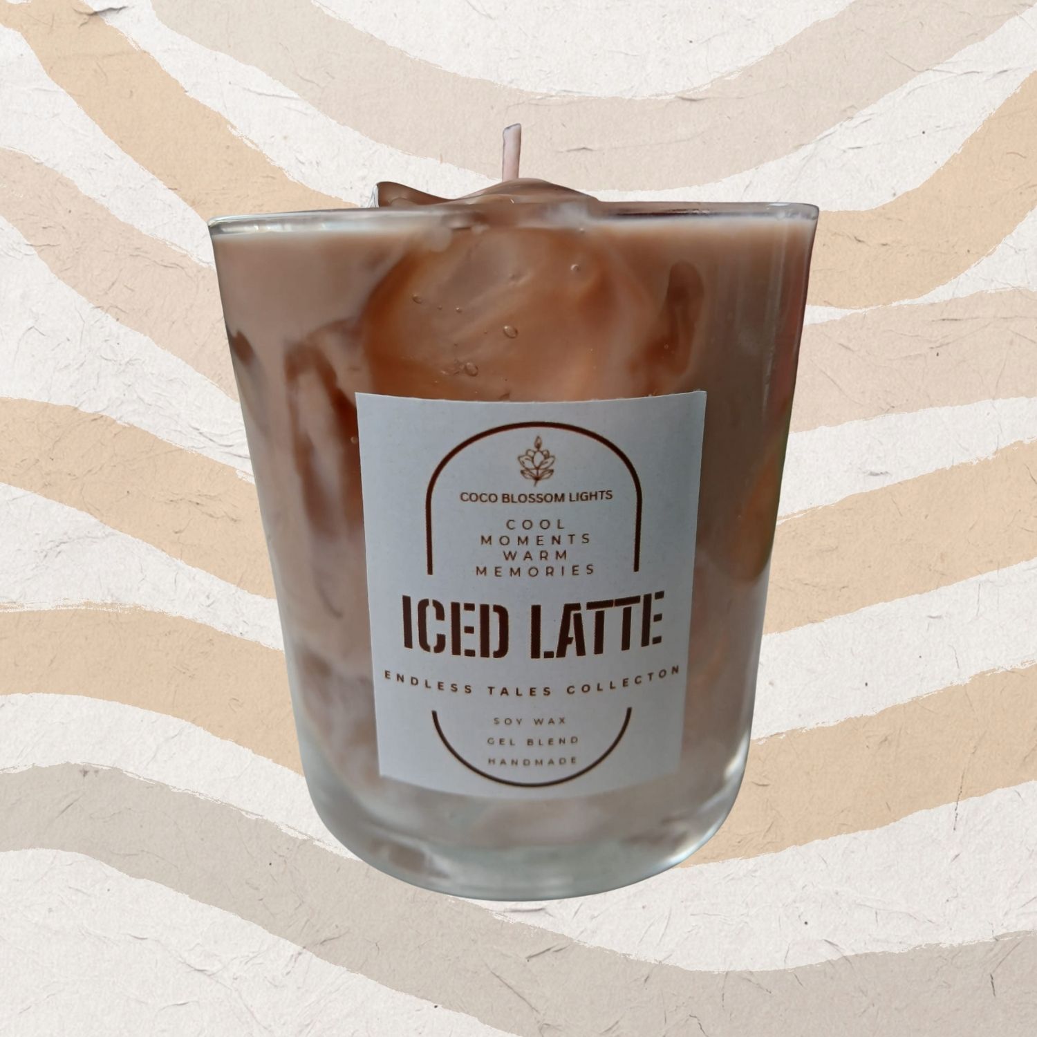 Süt ve kahve katmanları ile jel mum buz parçacıkları sayesinde gerçek buzlu latte görünümü sunan, vanilyalı kahve kokulu dekoratif mum.