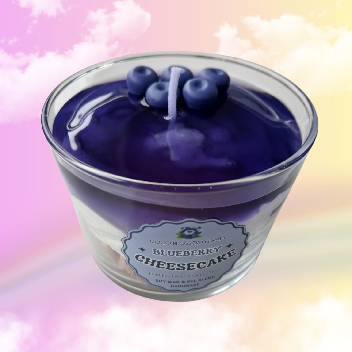 Bisküvi, krema ve yaban mersini katmanlarıyla görsel şölen sunan, tatlı bir atmosfer yaratan yaban mersini ve bisküvi kokulu el dökümü mum.