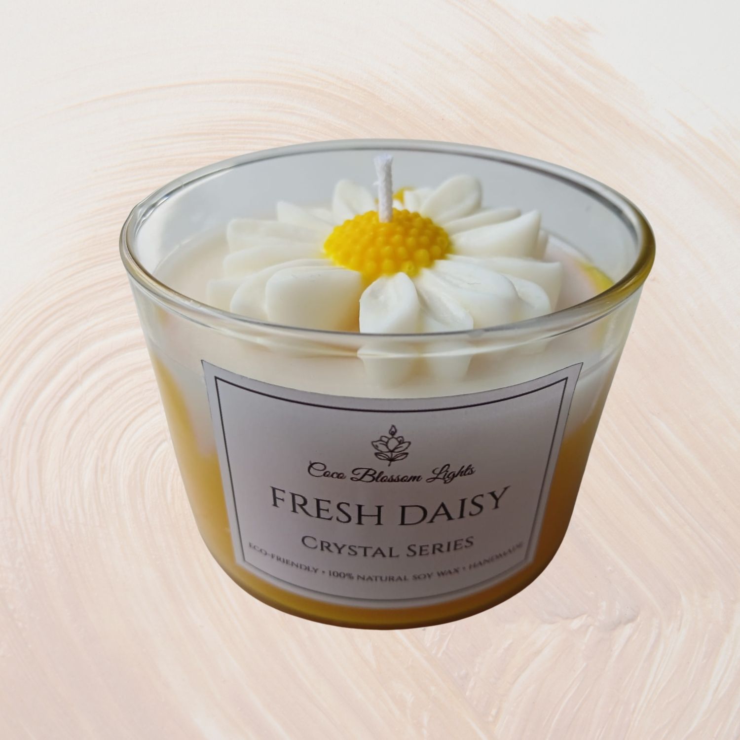 Cam kase içinde papatya detayıyla sunulan 220 gr el dökümü soya mum. Bahar tazeliği ve renkli neşesiyle bulunduğu ortama zarif bir canlılık katar.
