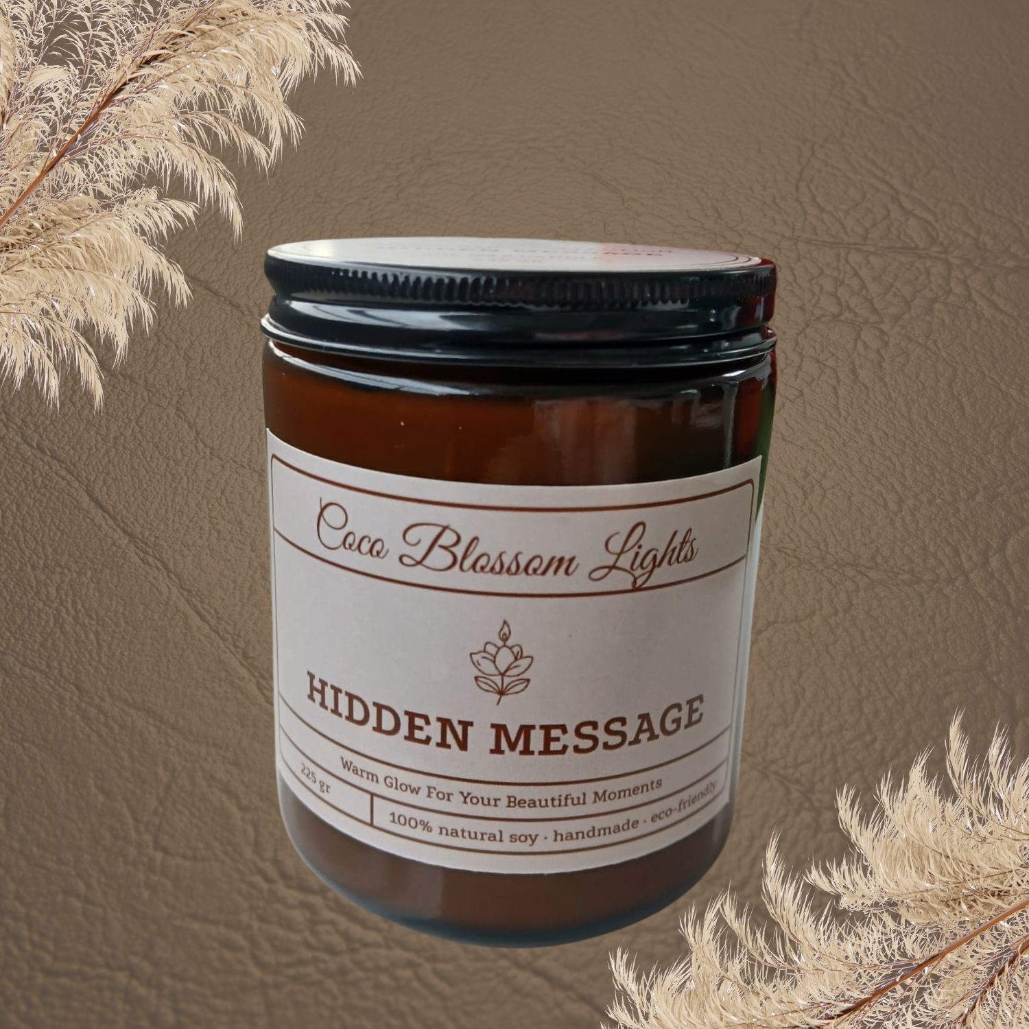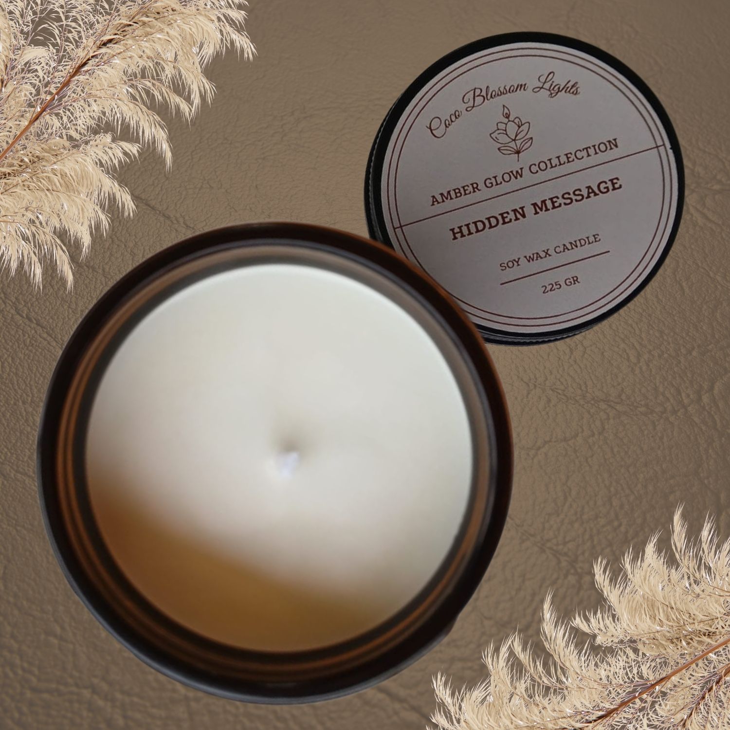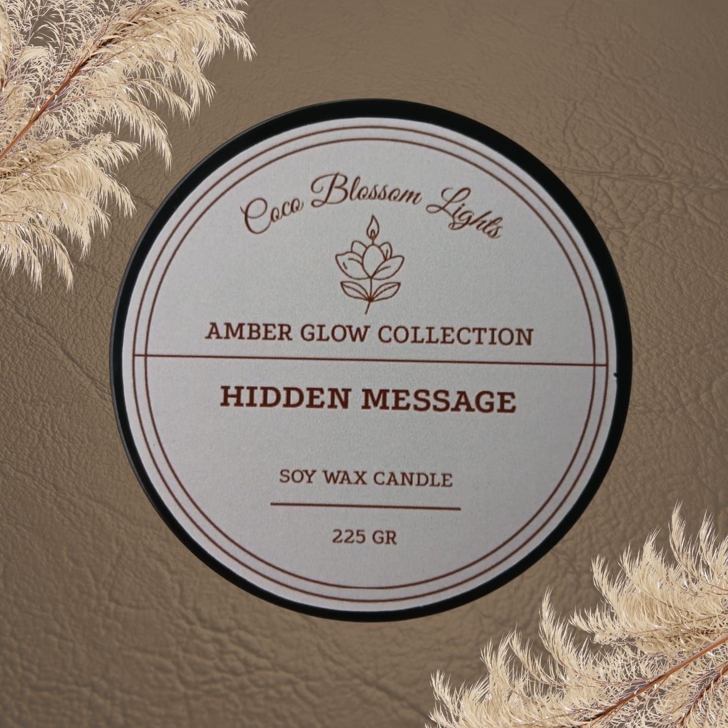 Hidden Message, Amber Glow Koleksiyonu’nun en özel ve en anlamlı tasarımlarından biridir. Amber şişede 225 gr %100 soya wax ile el dökümü olarak hazırlanan bu mum; sadece bir koku deneyimi değil, aynı zamanda sevdiklerinize verebileceğiniz duygu dolu bir mesaj taşıyıcısıdır.