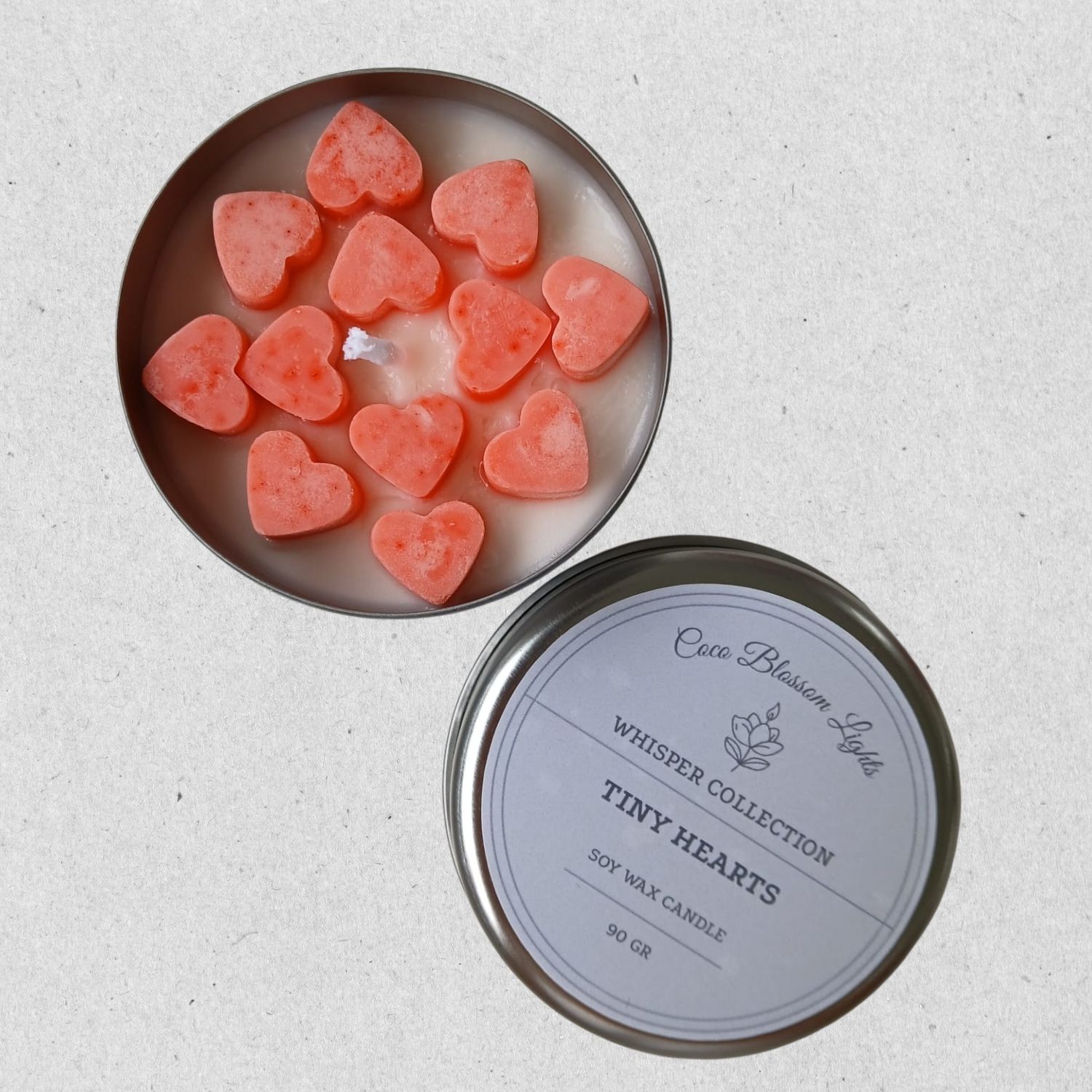 Tiny Hearts, Whisper Koleksiyonu’nun sevgi dolu ve neşeli detaylara sahip modellerinden biridir. 90 gr’lık gümüş kapaklı metal kutusunda sunulan bu el dökümü %100 soya mumu, yüzeyinde yer alan sevimli kalplerle her ortamda sıcak bir görünüm yaratır. Kalpler için farklı renk seçeneklerinin bulunması, ürünü yalnızca sevgiliye özel bir hediye olmaktan çıkararak tüm sevdiklerinize sunabileceğiniz zarif ve anlamlı bir armağana dönüştürür.