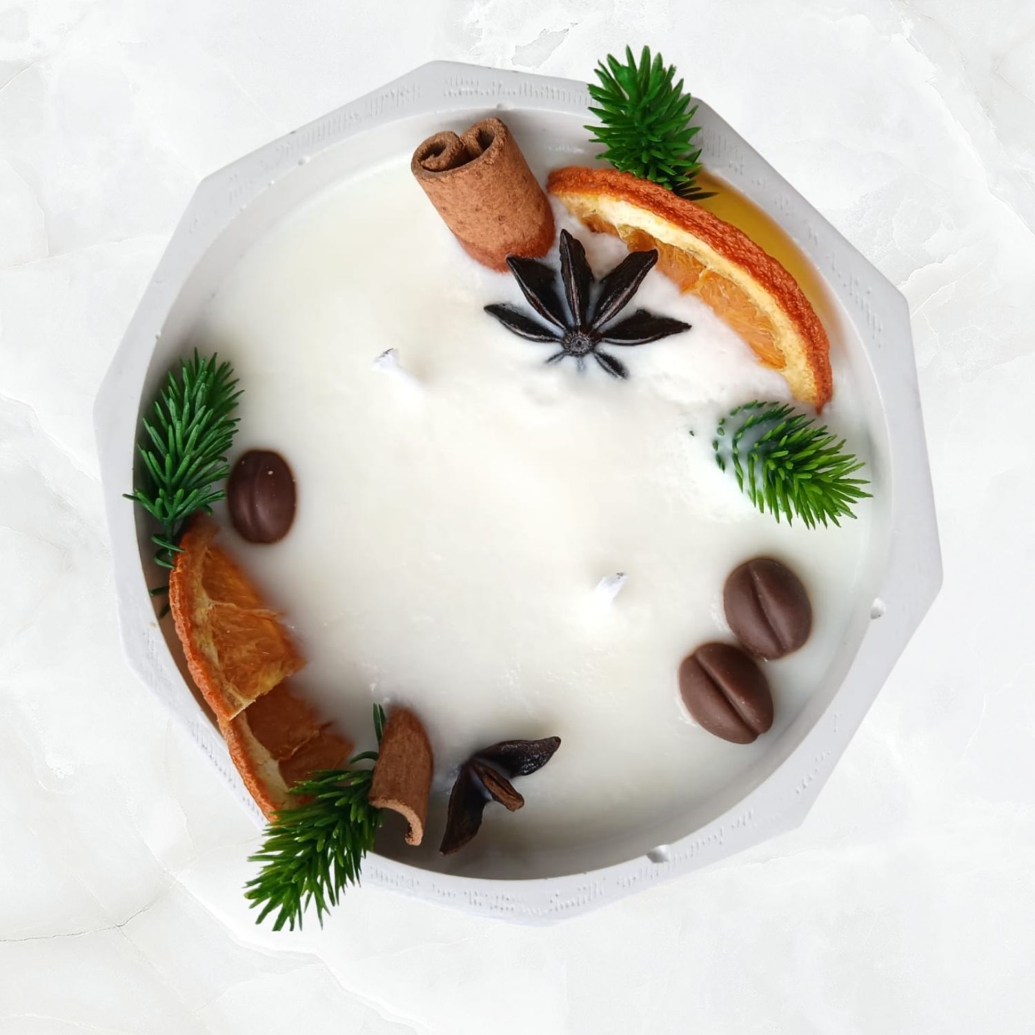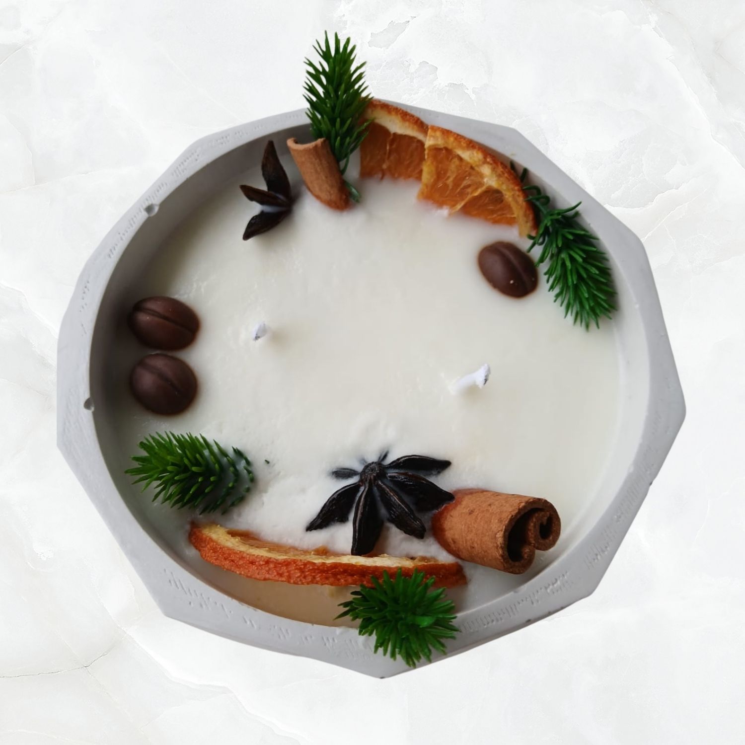 Kurutulmuş portakal, tarçın, yıldız anason ve ağaç dalı ile süslenmiş kış temalı premium taş kap soya mum. Sıcak, doğal ve dekoratif bir atmosfer için ideal.