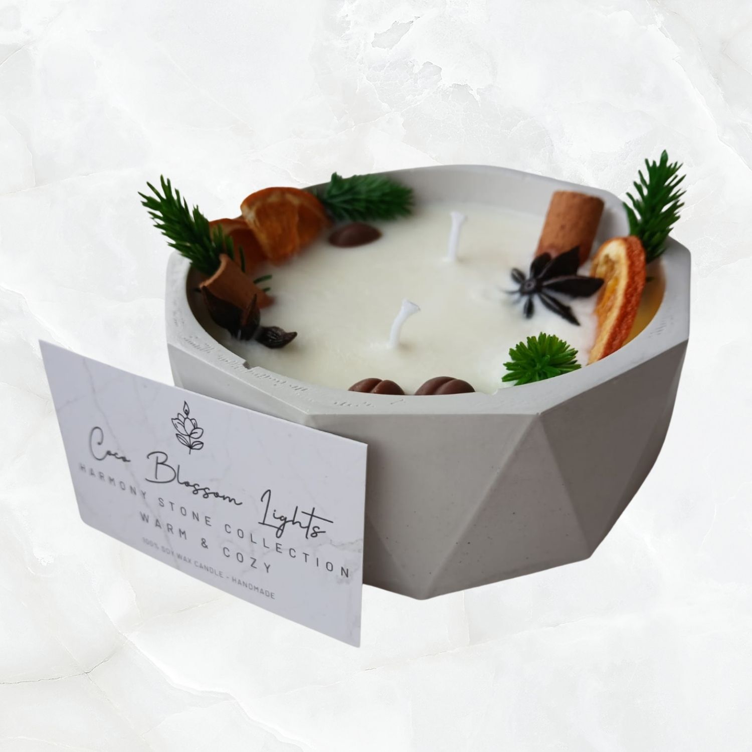 Warm & Cozy, Harmony Stone Koleksiyonu’nun kış ruhunu en estetik şekilde yansıtan özel tasarımlarından biridir. Coco Blossom Lights tarafından taş tozundan üretilen, geometrik desenli premium kap; kurutulmuş portakal, yıldız anason, tarçın parçaları ve küçük ağaç dallarıyla zenginleştirilmiş doğal bir görünüm sunar. Bu sıcak ve mevsimsel dokunuşlar, ürünü hem dekoratif hem de hediye olarak oldukça çekici kılar.